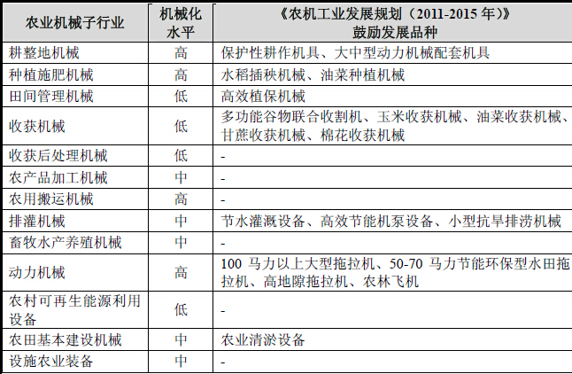 我国农业机械子行业的机械化水平以及受《农机工业发展规划(2011-2015年)》鼓励发展情况如下: