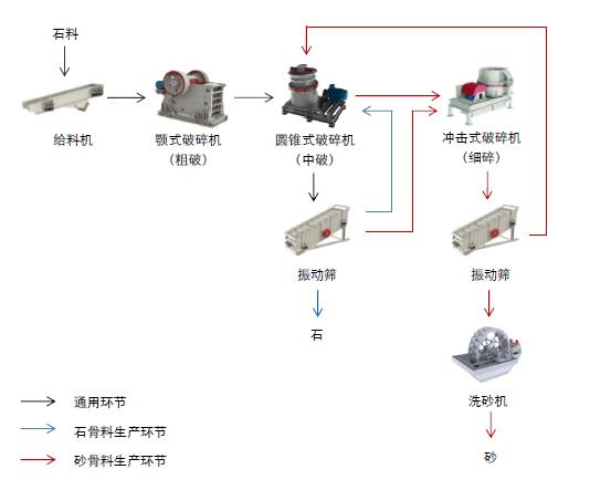 筛分设备是利用振动、旋转等动作,起到物料分选、分级、脱泥、脱水等作用的设备。随着工业生产的发展和技术水平的进步,筛分设备的创新主要围绕筛分效果的提升和使用寿命的延长,其他筛分设备如滚轴筛、摆动筛等已经逐步退出市场竞争。目前我国矿山常用的筛分设备包括圆振动筛、直线振动筛等。在砂石骨料生产过程中,破碎、筛分设备的应用情况如下图所示: