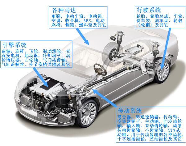 汽车,也可以说是各种回转零部件的组合体。汽车制造业是全自动平衡机的另一重要市场领域,除电机外,汽车使用的其他回转零部件可分为轴类件、轮毂及盘类和风扇类回转零部件等,轴类包括发动机曲轴、涡轮增压器、传动轴、新能源汽车电机等零部件,轮毂及盘类主要包括启动飞轮、离合器压盘、离合器总成、轮胎、齿轮、刹车鼓和刹车盘等零部件,风扇类主要包含冷却风扇和空调风扇等零部件。汽车回转零部件构成具体如下图所示: