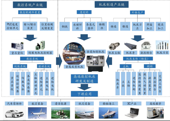 数控机床的产业链比较复杂,上游不仅有钢铁、铸锻件等原材料,还有包括液压电气相关的各类元器件以及电机中所需要使用的永磁材料。下游应用则包含汽车、3C、能源、航空航天等多个领域。