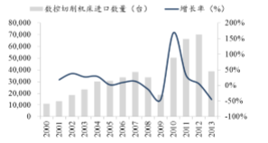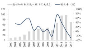 我国高端数控机床70%~80%进口,高端数控系统90%以上依赖进口,替代空间大。考虑到在德国、日本等工业自动化程度较高的国家中,机床数控化率已经达到了60%-70%,预计国内机床数控化率也将快速提升。若国内机床数控化率达到50%,将带来超过3,000亿的市场空间。以数控机床中附加值较高的磨床和剪切机床为代表,根据海关总署数据,2013年我国进口数控磨床金额约为10.28亿美元(占总销售额的87%),进口数控剪切机床金额约为1.64亿美元(占总销售额72%),高端数控机床有很大国产替代空间。