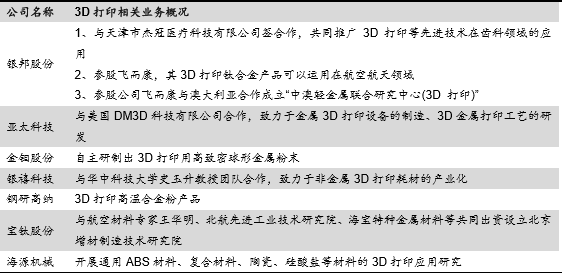 虽然国内3D打印产业在近年来得到长足的进步,但是3D打印材料还缺乏相关国家标准,国内有能力生产的企业数量较少,且产品质量参差不齐。这就导致国内3D打印需要大量进口国外3D打印材料,不仅造成3D打印产品成本较高,也影响了产业在国内的推广。目前国内正越发重视3D打印材料的研制,银邦股份、钢研高纳、宝钛股份等正在致力于3D打印金属材料的研制;金钼股份和银禧科技则致力于非金属材料的研制。