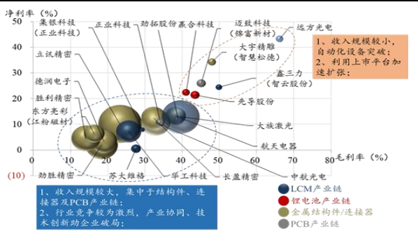 2、盈利能力相对一般的企业收入规模普遍较大,且行业竞争较为激烈。以长盈精密、东方亮彩等为代表的手机结构件生产商已经具备了一定规模,但是受到终端厂商对盈利空间的挤压,议价能力有所不足。产品较为复杂的3C企业未来有进行自动化改造,从而降低成本,提升盈利能力的需求。