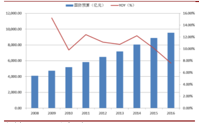 经济持续高速发展,国防军费预算稳定增长:2015年国防军费预算达到8868.98亿元,同比增长为10.1%,2016年国防预算为9543.54亿元,同比增长7.6%。虽然总量较大,但是跟其他国家相比,国防军费占GDP比重依然较低,我们预计未来国家会更加重视国防力量建设,国防军费预算未来仍将保持较高的增速,其中对装备的投入占比也将进一步由目前的1/3增加到40%,其中航空装备将是最重要的投入领域之一。