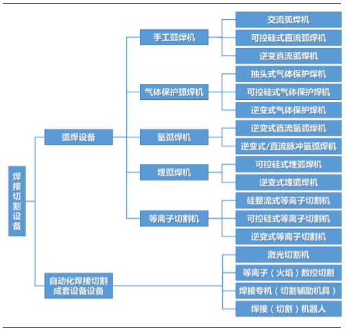 焊接与切割设备,是指将电能及其他形式的能量转化为焊接和切割能量并对主要是金属材料进行连接或切割成为具有给定功能结构的制造设备。焊接与切割技术是一种集机械学、电工电子学、工程力学、材料学、自动化控制技术以及计算机技术等多种学科的综合性先进技术。