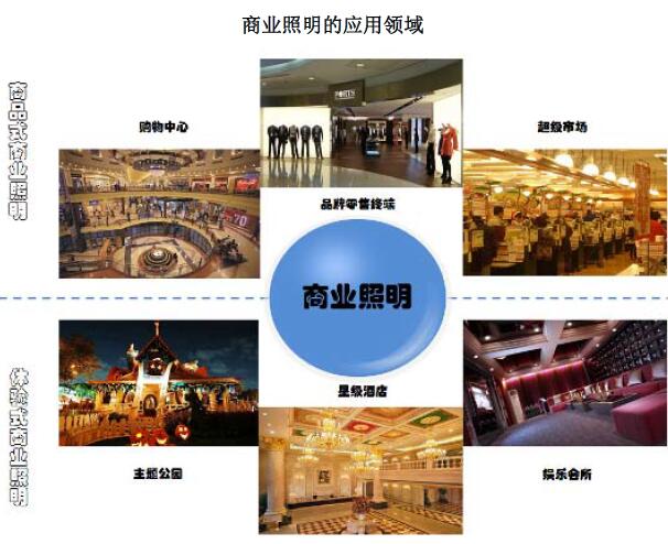 商业照明是指营造商业场所光影环境,用以满足照亮空间、产品展示等基础性需求,以及氛围渲染、品牌提升等功能性需求的照明系统,广泛地运用于品牌零售终端、购物中心、超级市场等以销售产品为目标的商品式商业领域和星级酒店、主题公园、娱乐会所等以提供服务为目标的体验式商业领域。商业照明的应用领域