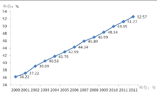 近年来我国城市化进程2000 年至2012 年中国城市化水平迅速提高,具体情况如下: