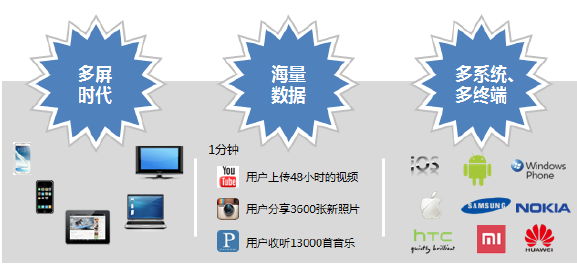 移动互联网的出现开创了全新的多媒体业务运营环境。首先,随着智能手机、平板电脑等移动终端的出现,智能电视的普及率越来越高,多媒体消费进入全新的多屏时代;其次,多媒体内容由单向传递为主转变为社交网络下的交互并发,多媒体内容迎来海量数据时代;再次,面对移动互联网“多系统、多终端”并存的复杂环境,多媒体业务运营需要解决内容统一快速展现的需求。移动互联网的出现开创全新的多媒体业务运营环境