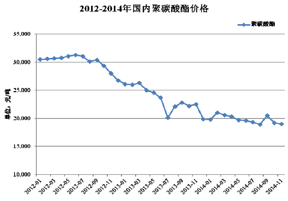 由上可见,聚碳酸酯在2012-2014年间价格有所下降,主要为塑料粒子作为石油化工的衍生物,价格变动取决于其基础产品的市场供需体系。
