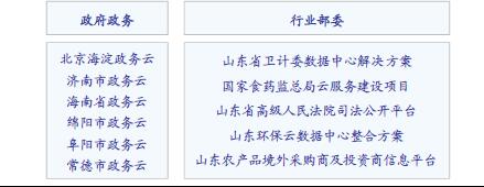 浪潮在政府政务和行业部委领域积累的客户案例包括北京海淀政务云、济南市政务云、海南省政务云、卫计委数据中心解决方案、国家食药监总局云服务建设项目等,为近60个地市、15个部委提供云计算服务。公司云主机和在线应用(舆情服务)通过了可信云认证,在数据存储可靠性、安全性、业务可用性(云主机达到99.95%)等方面都达到较高水准。浪潮云政务客户案例