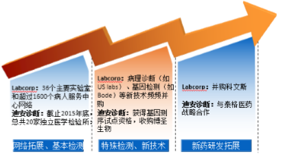 迪安的一系列布局,不难看出其中的LabCorp“影子”。LabCorp在发展初期就专注做网络拓展、基本检测,最近几年随着基因测序、病理诊断等新技术的迅猛发展,公司开始聚焦在新技术的平台搭建、并购上,而在去年底,公司则将做新药研发的CRO公司Covance并购,也可以进行药物的研发外包服务。