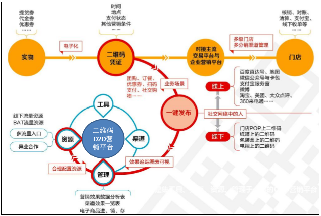 1)B2B2C的二维码O2O业务营销平台,集合销售工具,营销渠道,营销资源和营销管理等,例如商家商品/服务/卡券等绑定二维码,做O2O营销,更能提供营销和支付工具,是整个营销行为数据化,便于统计,管理和分析,最终形成拥有海量数据与资源,各平台角色与平台用户合作共赢的生态环境,可以贯通通信、石油石化、金融保险、餐饮食品、零售、媒体广告、互联网和教育培训等与普通用户息息相关的日常应用场景。