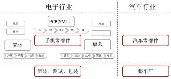 电子行业可以同比汽车行业。汽车行业分为汽车零部件供应商和整车厂。电子行业分为电子零部件供应商和电子组装厂商。汽车行业的零部件供应商包括:零部件包含诸如发动机、制动、空调、仪表盘、灯具、内饰、外饰等。同样,电子行业的零部件供应商包括:壳、屏、PCB、电池、镜头、音响等等
