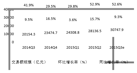 线上支付一般指通过互联网实现用户和商户或者商户和商户之间在线支付、资金清算、查询统计等过程。由下表交易规模来看,互联网支付2015年第三季度交易量达3亿,环比增长9.3%,同比略有下降是由于三季度属于电商网购进入淡季,同时基金申购量有所下降导致。