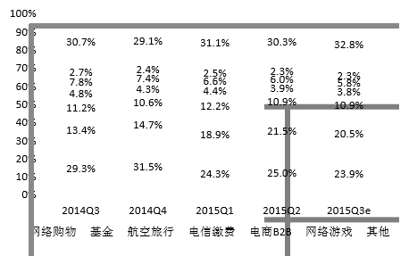 在互联网支付领域,支付宝依然占有近一半份额,按照2015年第三季度的交易规模3万亿元来看,支付宝占47.6%,财付通20.1%及银联商务11.1%,银联商务与支付宝相差近1万亿元。与银联垄断线下业务相比,支付宝、财付通等互联网型支付企业成功攻占线上支付业务。这种绕过银联网络,通过与发卡行直接交易的新型支付方式极大的便利支付过程,很快打开其海量的应用市场。