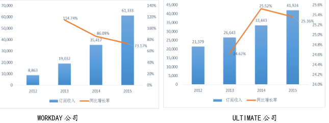 WORKDAY公司的订阅收入迅速增长,2013年同比增长率达114%,之后逐渐下降,2015年还是保持在73%的高水准。ULTIMATE公司的收入增长较为稳定,近年来都保持在25%上下。