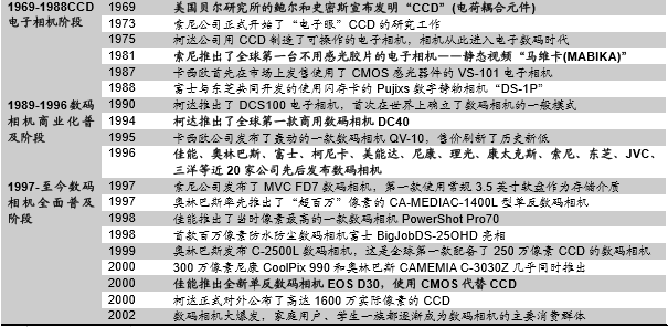 1951年宾克罗比实验室发明了录像机(VTR),被视为了电子成像技术的产生;1969年,美国贝尔研究所的鲍尔和史密斯宣布发明“CCD”(电荷耦合元件);1973年11月,索尼公司正式开始了“电子眼”CCD的研究工作,于1981年推出了全球第一台不用感光胶片的电子相机——静态视频“马维卡(MABIKA)”;到了1994年数码影像技术已经以一日千里的速度获得了空前发展。柯达推出了全球第一款商用数码相机DC40。
