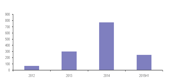 2014年以来行业融资量大幅攀升(单位:百万美元)