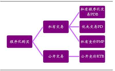 程序化购买按照交易是否公开又可以分为公开交易和私有交易,其中公开交易主要采用以RTB实时竞价模式,而私有交易采用的竞价方式主要有三种:PDB私有程序化购买、PD优先交易、PMP私有竞价,它们的区别在于是否竞价以及广告位是否预留。