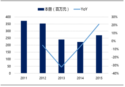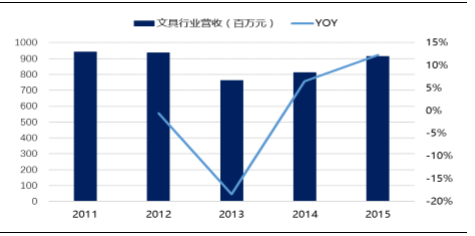 2015年公司在文具行业营收增长12.31%,其中办公用品营收增长30.02%。公司在文具行业营收较为稳定,近三年出现小幅增长。公司在文具行业以办公产品为主,同时涉及本册、包装物、相册、精品图书、纸张纸浆等文具类产品。公司办公产品营收连续多年增长迅速,而包装物、相册、纸浆纸张等产品营收呈现出下降趋势。
