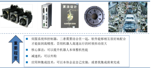国内机器人本体要发展的好,在“伺服系统”、“控制器”、“核心算法”、“精密减速器”,以及“应用和集成技术”这五大领域至少要有2-3个是擅长的。