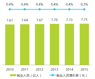 2011年中国GDP总量为48亿元,实际GDP(即不变价格计算)增长率为9.5%,2015年GDP增长至67亿元,虽然总量保持稳定增长趋势,但增长率下降为6.9%。同时,随着我国经济增长放缓和人口红利的逐步消退,就业人员数量增长非常缓慢。