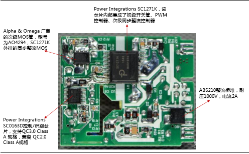 PowerIntegrationSC1271K芯片是该充电器中的核心芯片。电路板背面的次级MOS管是由Alpha&Omega提供的,配合PowerIntegrations1271K使用,形成同步整流。