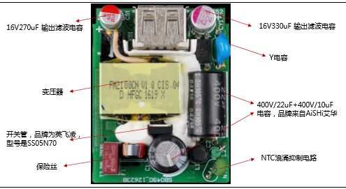 小米5充电器内部由固态电容、Y电容、阻燃保险丝、控制识别芯片等部分组成。