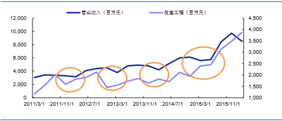 电子行业在建工程增速与营业收入增速正相关
