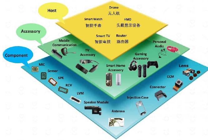 从自身角度来看,中国的电子企业借助智能手机的爆发在技术先进性、产品可靠性、供应链管理有效性方面大幅度提升,在电子元器件、模组与配件、系统与整机各个方面,均具有了与日韩、台湾厂商一较高下的实力,甚至在许多领域达到全球领先的水平。大陆电子代表性企业歌尔股份的垂直整合产业链产品结构