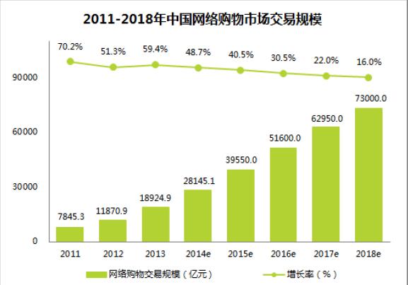 艾瑞咨询数据显示,2014年中国网络购物市场交易规模达2.8万亿,同比增长8.7%。根据国家统计局数据,2014年全年社会消费品零售总额为26.24万亿,网络购物交易额占社会消费品零售总额的比重达到10.63%,比2013年提高2.85个百分点。