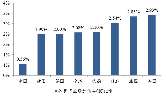国家体育局数据显示,2013年中国体育产业年增加值占GDP的比重为0.56%,预计2015年将基本实现产业增加值4000亿元,占GDP比重提高到0.7%。数据同时显示,2013年全球体育产业年增加值接近9000亿美元,其中美国体育产业年增加值达到4500亿元,占到全球的一半,约占美国该年GDP的2.93%,我国体育产业规模仍然较小。