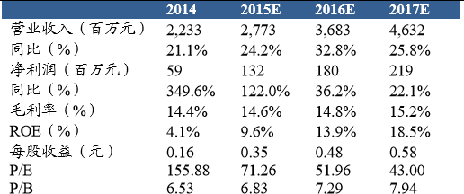 公司纺织业务保持稳定发展,每年贡献利润约3000-5000万元。公司定增方案将于近日过会。影视剧业务将大幅增厚公司利润,结合目前IP市场的火爆程度,有望超额完成承诺业绩。我们预计公司15-17年实现营业收入27.73亿元、36.83亿元和46.32亿元,EPS分别为0.35、0.48和0.58元,当前股价24.94元,对应16/17年PE51.96/43.00倍。