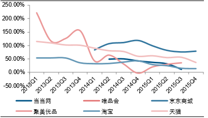 2013Q1-2015Q4当当、京东、聚美、淘宝、天猫GMV增速