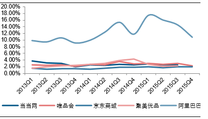 销售费用率方面,当当呈现出持续下行趋势,Q3同比下降2.60%;唯品会、聚美、阿里销售费用率总体稳定,分别维持在5%、10%、11%附近;京东销售费用率呈现出上升趋势,Q4同比增加0.64%。