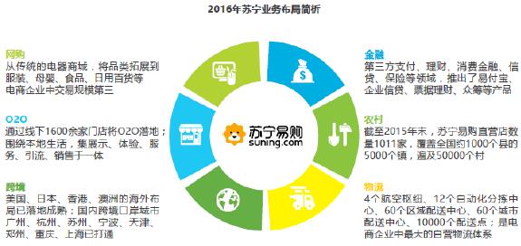 苏宁的发展战略简称一体、两翼、三云、四端,即以互联网零售为主体,以线上线下的开放平台为两翼,建立面向供应商和消费者以及社会合作伙伴开放的物流云、数据云和金融云,融合布局POS端、PC端、移动端、电视端。2016年苏宁业务布局简析