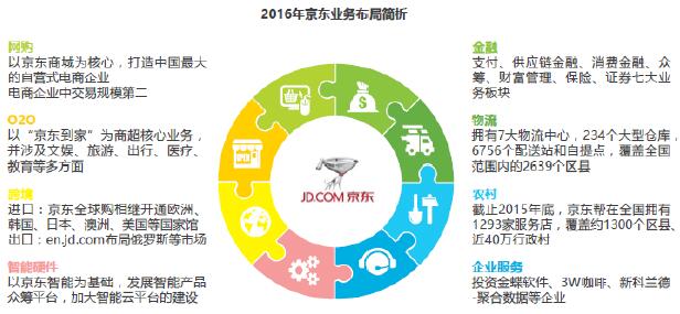 京东集团的核心业务领域包括电子商务、金融、智能硬件、本地生活,分别对应京东商城、京东金融、京东智能、京东到家,以及接下来要大力发展的企业服务领域。2016年京东业务布局简析