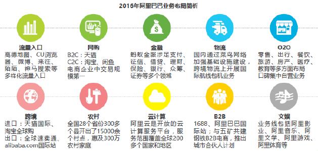 阿里巴巴的商业模式是通过自有电商平台沉积以及UC、高德地图、企业微博等端口导流,围绕电商核心业务及支撑电商体系的金融业务,以及配套的本地生活服务、健康医疗等服务,打造囊括电子商务、游戏、视频、音乐等泛娱乐业务和智能终端业务的完整商业生态圈。这一商业生态圈的核心是数据及流量共享,基础是营销服务及云服务,有效数据的整合抓手是支付宝。2016年阿里巴巴业务布局简析