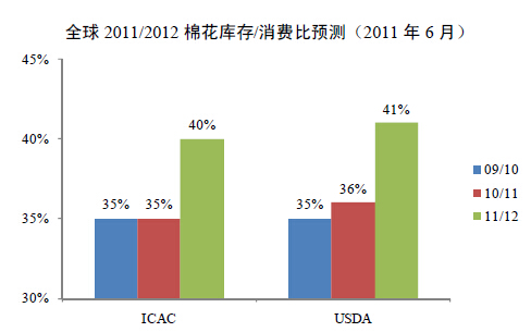从生产环节来看,棉花价格的频繁波动致使棉花种植的比较收益在年度间波动较大,这将直接影响到农民下一年度种植的积极性,从而导致棉花种植面积在年度间大起大落,反过来又进一步加剧棉花价格的波动。2009年我国全年棉花产量640万吨,比上年减产14.6%。同时,经济危机之后下游需求持续恢复以及棉花种植成本上升,共同导致2009/2010年度棉花期末库存不断消耗,为棉价提供了较强支撑。全球2011/2012棉花库存/消费比预测(2011年6月)