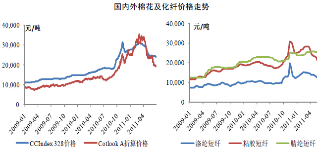 棉花自2010年初开始步入上升通道,并于2011年一季度再次大幅上涨,国内328级和海外CotlookA折算价最高分别为31,241元/吨和44,490元/吨,达历史高位。2011年3月下旬棉花价格出现下跌,至2011年6月初国内328指数和海外CotlookA折算价分别为24,559元/吨和30,962元/吨,分别较最高价格下跌20%和30%,但仍较2010年初分别上涨65%和106%。2011年4月其他原材料价格也出现回落,至2011年6月初,涤纶短纤和粘胶短纤分别回落至12,650元/吨和20,500元/吨,分别较2010年底最高点回落36%和33%。未来棉花及其他原材料的价格如继续维持在高位或者波动幅度加