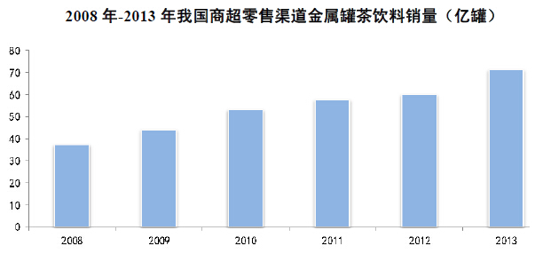 按照茶饮料包装类型统计,我国商超零售渠道金属包装茶饮料销量由2008年的37.46亿罐增至2013年的71.44亿罐,年均复合增长率13.79%。随着人们健康消费理念的不断深入、“去火”概念的普及和厂商渠道拓展力度的加强,以多采用金属包装的两罐茶(王老吉和加多宝)凉茶消费量增速最为显著,进而带动我国茶饮料行业金属包装的消费需求。2008年-2013年我国商超零售渠道金属罐茶饮料销量(亿罐)