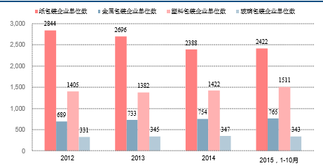 玻璃包装行业:企业数量众多,地域聚集度较高,行业集中度仍然较低,截止2015年10月,规模以上企业仅343家。