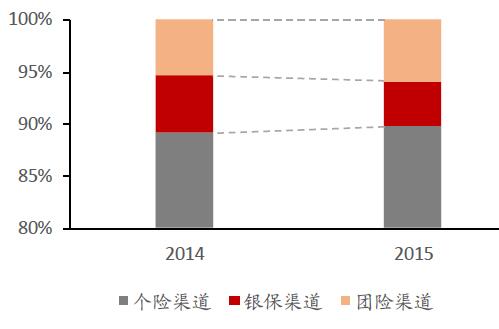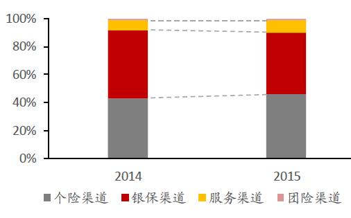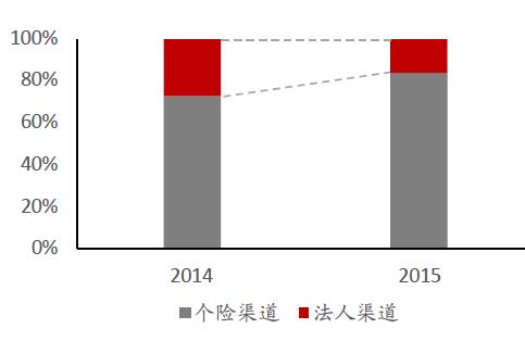 在个险渠道不断增强的同时,资源消耗较大成本较高的银保渠道有所收缩。其中,中国太保银保渠道收入占比大幅收缩,截止2015年底太保法人渠道占比仅占16%,较去年同期下降11%。而中国人寿、中国平安也纷纷将重心篇向个险渠道,银保渠道收入占比略有收缩。值得注意的是一直以银保渠道为主的新华保险经过一年的调整,银保渠道保费收入占比从49%下降到44%。中国太保渠道收入结构