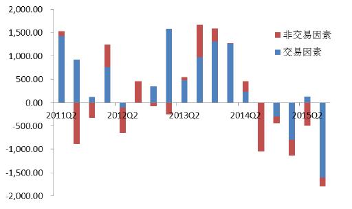 理论上,国际收支表的外汇储备变动只包括交易因素,而国际投资头寸表和央行公布的外汇储备则包括了交易因素和非交易因素,二者之差可以推断非交易因素对于外汇储备的影响。外汇储备变动因素构成(亿美元)