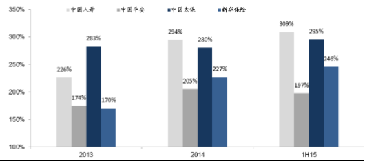 2015上半年上市保险公司的偿付能力充足率保持平稳,主要由于存量业务的利润释放基本可以满足新业务高速发展带来的资本需求。截至半年末,中国人寿/中国平安/中国太保/新华保险偿付能力充足率分别为309%/197%/%/246%。