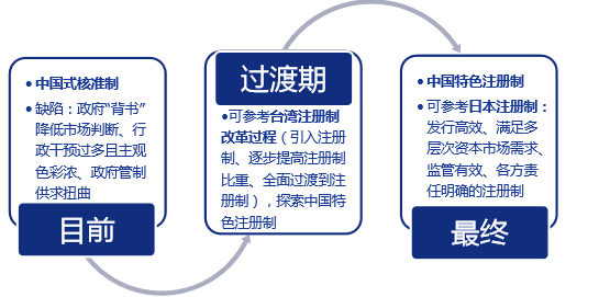改革路径可参考台湾,最终较理想状态可参考日本:1960年之后台湾经济金融开始自由化改革、对政府与市场的职能划分与转变的大背景与我国目前的全面改革类似,同时台湾也是由核准制过渡到注册制,因此我国注册制改革的过渡阶段可以借鉴台湾注册制改革经验。在过渡期,相关监管措施、法律制度、市场环境、各参与者责任等逐步培育与完善。最终建立市场主导、责任到位、披露为本、预期明确、监管有力的股票发行上市制度,可参考市场化程度高的日本注册制。