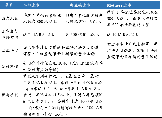 注册制满足多层次资本市场需求:日本股票市场主要包括市场一部(主板)、二部(中小板)、Mothers(创业板)、JASDAQ(新兴企业取向市场)、PRO(场外市场、针对专业投资者)。目前日本注册制很好的满足了多资本市场的需求,不同层次市场区分度明显,从IPO融资规模上可以看出Mothers(创业板)上市门槛较低;另外一部、二部有盈利指标要求,而Mothers上市不设盈利指标要求。
