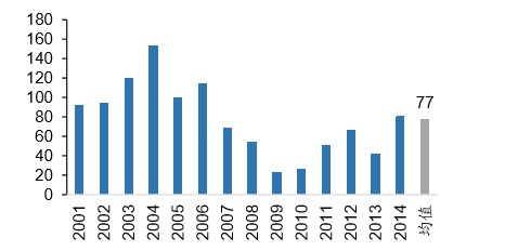 东京证券交易所2001-2014年IPO上市数量