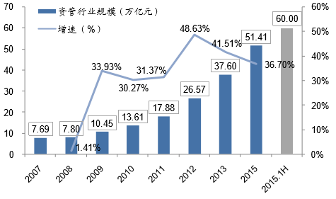 资管规模10年增长超30倍,复合增长率在40%以上:我国民间财富的逐年增长,居民理财意识在逐渐提升,同时由于金融创新产品的不断推出,从需求端和供给端共同推动资产管理业务快速发展,2004年资管规模约为1.5万亿,2007年资管规模为约为7.7万亿,到2014年底广义资管规模达到52万亿,去除通道重合部分,估算也达42万亿,近10年来复合增长率在40%以上。中国资产管理行业的发展未来五年会从现在的60万亿增长到100万亿的规模。