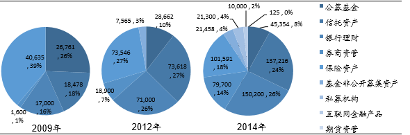 监管放宽破除壁垒,由基金、信托、保险、银行理财四大金刚逐步走向“大资管时代”:在2012年资产管理新政出来之前,我国资管市场上基金、信托、保险和银行理财占据主导地位,自2012年下半年以来,各项资管新政轮番推出,打破了银行、证券、保险、基金、信托等金融机构的竞争壁垒,扩展了资产管理业务外延,推动了金融机构的全产业链经营布局。与此同时,第三方资产管理公司、互联网企业也凭借信息技术优势和独特市场定位,在高端市场、小额理财等细分领域实现了快速发展。银行理财、信托、保险、基金管理公司及其子公司、证券公司、期货公司、私募基金管理机构为主的格局,已逐步形成。